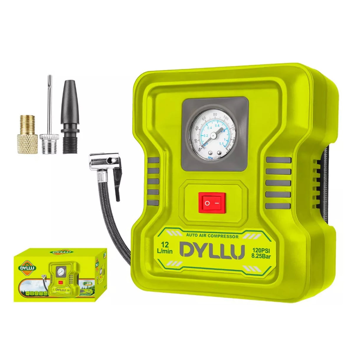 - DYLLU DTAAC501 – бытовой автокомпрессор, готовый к работе, сразу после распаковки