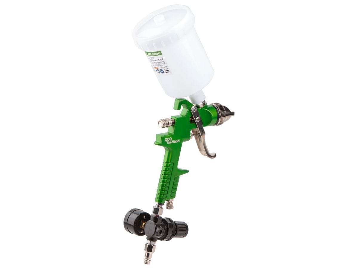 Краскопульт пневматический ECO SG-9000 с манометром (EC1535-14) для нанесения базовых эмалей, акриловых эмалей и прозрачных лаков, жидких первичных грунтов. Краскораспылитель HVLP с набором регулировок. Регулятор с манометром в комплекте позволяет настроить работу краскораспылителя максимально точно.