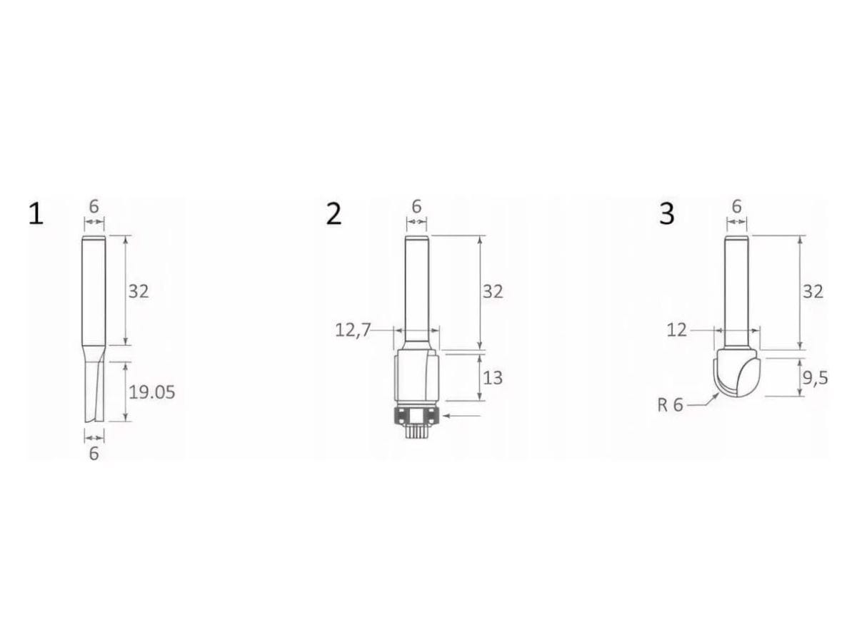 копировальная фреза: диаметр 12.7 мм, рабочая длина 13 мм, хвостовик 6 мм, имеет подшипник в нижнем расположении, максимальное количество оборотов 28000 об/мин;