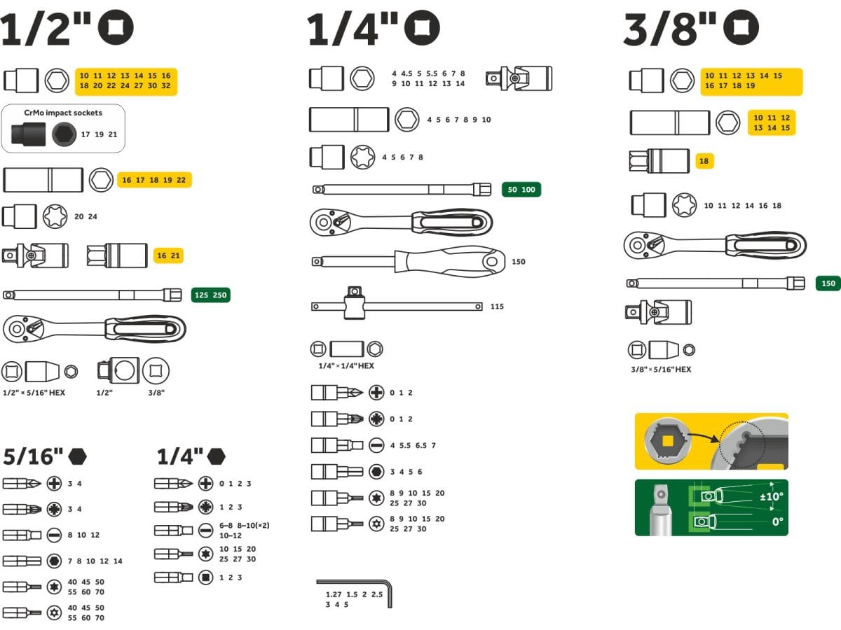 | Трещотки | 1/4", 3/8", 1/2" |
