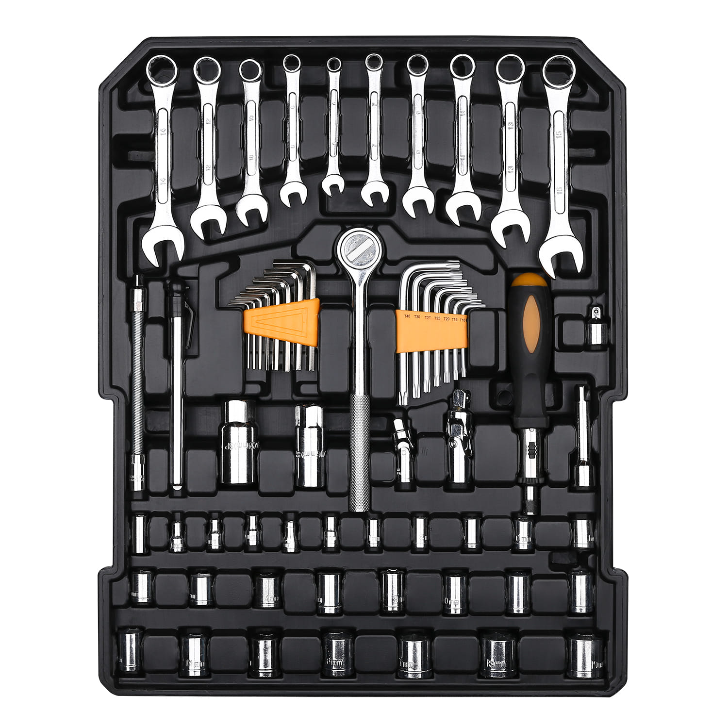 - Всё необходимое - набор включает в себя множество самых популярных насадок, трещотки, гаечные ключи, шестигранный ключ, биты, универсальный шарнир и т.д.