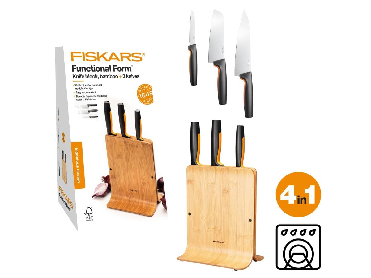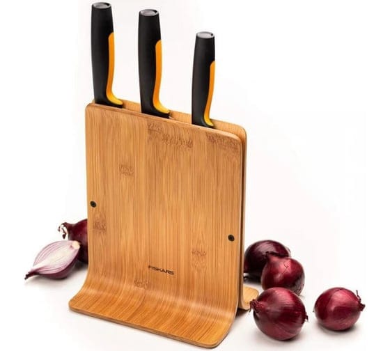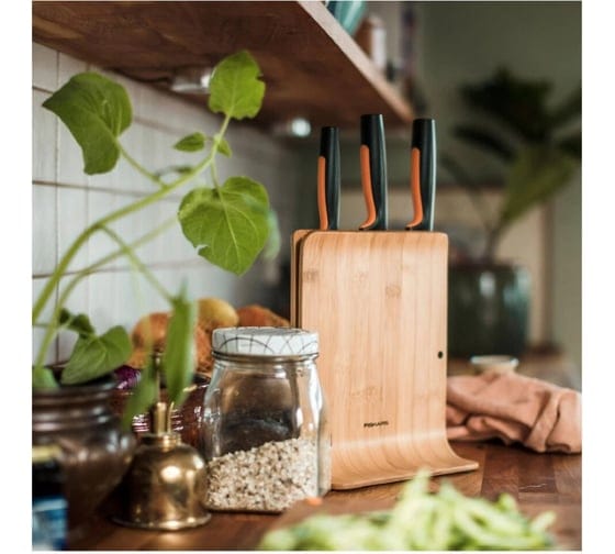 Набор ножей 3 штуки FISKARS FF бамбуковый блок (1057553) - набор из 3 ножей в блоке Fiskars Functional Form™ - подарочный набор, состоящий из блока из бамбукового дерева с тремя наиболее часто используемыми кухонными ножами. Идеально подходит для любого дома.