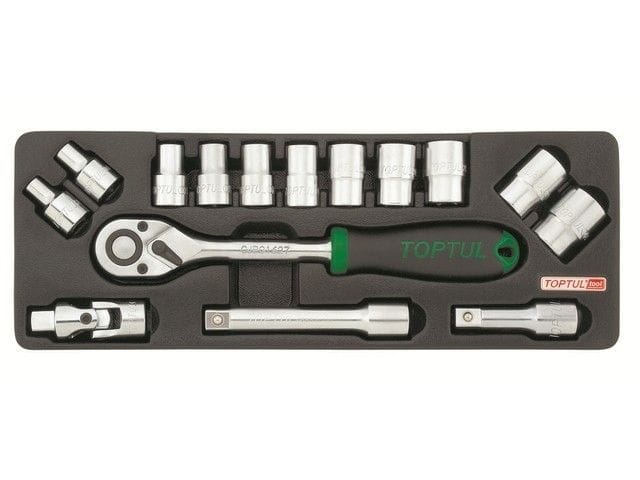 Набор-сет в ложементе торцевых головок 1/2" TOPTUL состоит из 15 предметов. Рекомендуется для профессионального использования