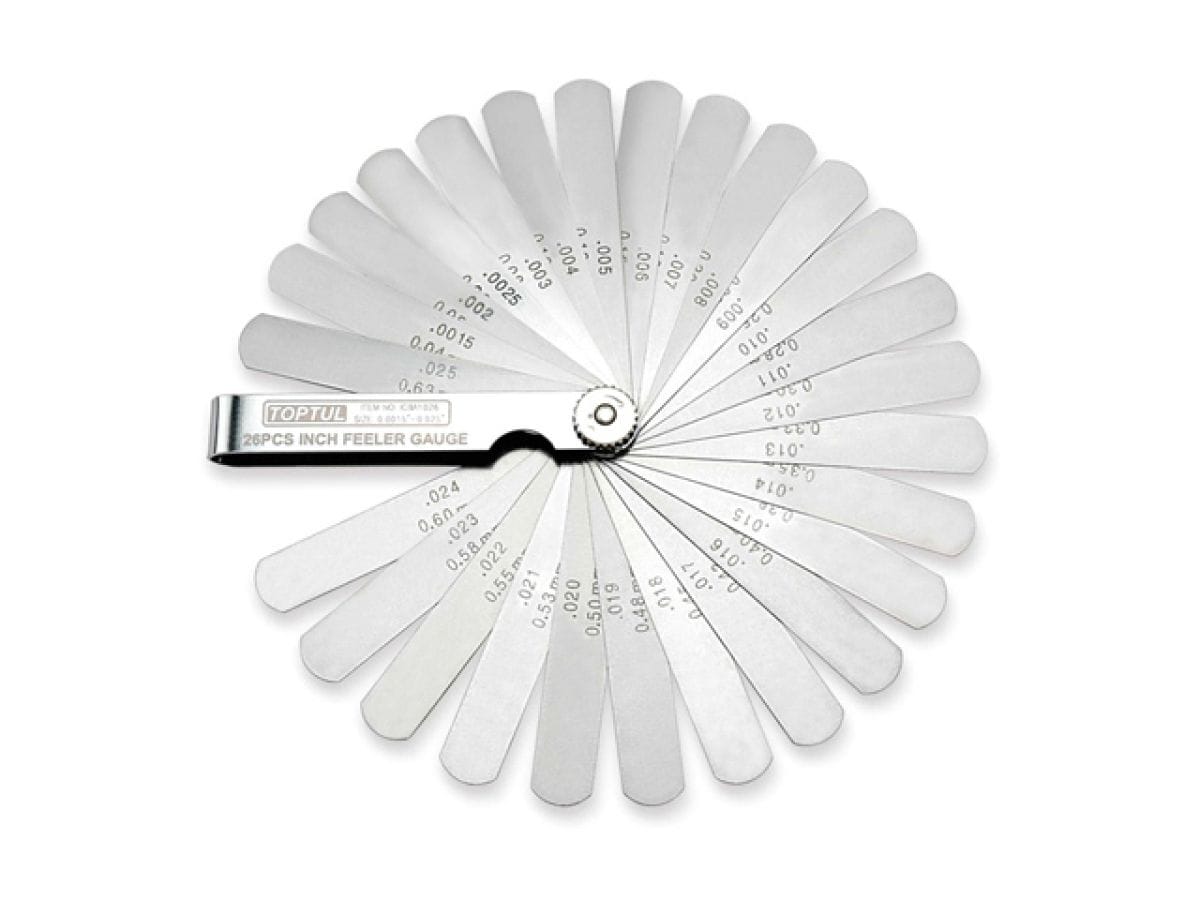 Набор щупов 26 штук дюймовых TOPTUL (ICBA1026) выполнен из закаленной пружинной стали. Щупы имеют двойную маркировку: в дюймовой и метрической шкале. Стальной чехол имеет специальную выемку для удобного извлечения щупа. Чехол оснащен блокиратором для безопасного хранения и транспортировки инструмента.