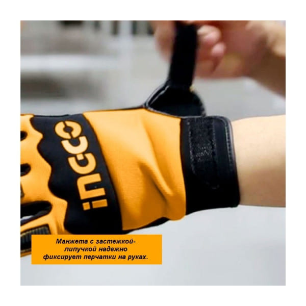 - Манжета с застежкой-липучкой надежно фиксирует перчатки на руках.